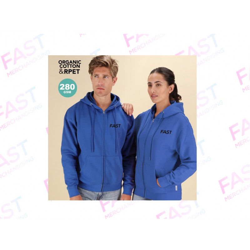 Sudadera Unisex con capucha y cremallera de Algodón Orgánico y Poliéster Reciclado, en suave felpa perchada de 280 g/m2. Con capucha forrada de doble capa, cordones redondos ajustables -con topes a juego- y ojales metálicos. Puños y cintura de punto canalé de elastano y bolsillo frontal tipo canguro. Apertura de cremallera oculta metálica, con cubrecosturas reforzado en cuello. Incluye etiqueta distintiva eco.